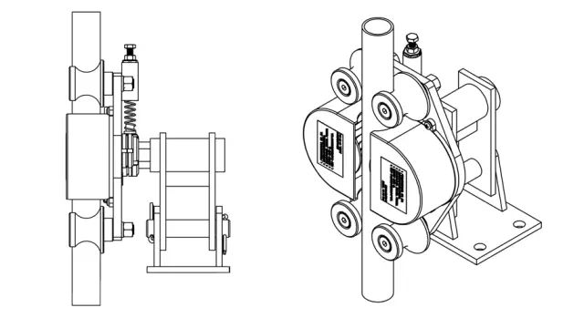 防墜器的底座固定于吊籠的頂部,導(dǎo)軌穿過前端的導(dǎo)向輪和偏心輪。吊籠正常升降的情況下,防墜器上下兩對導(dǎo)輪夾著導(dǎo)軌平穩(wěn)運(yùn)行,中間的偏心輪處于張開狀態(tài),當(dāng)鋼絲繩斷裂吊籠瞬間墜落時,防墜器的底座跟隨吊籠瞬間下落,瞬間下落的過程中,拉動防墜器主軸,防墜器內(nèi)部的齒條、小齒輪及偏心輪發(fā)生聯(lián)動反應(yīng),偏心輪瞬間卡住導(dǎo)軌,吊籠在200mm內(nèi)停止墜落。