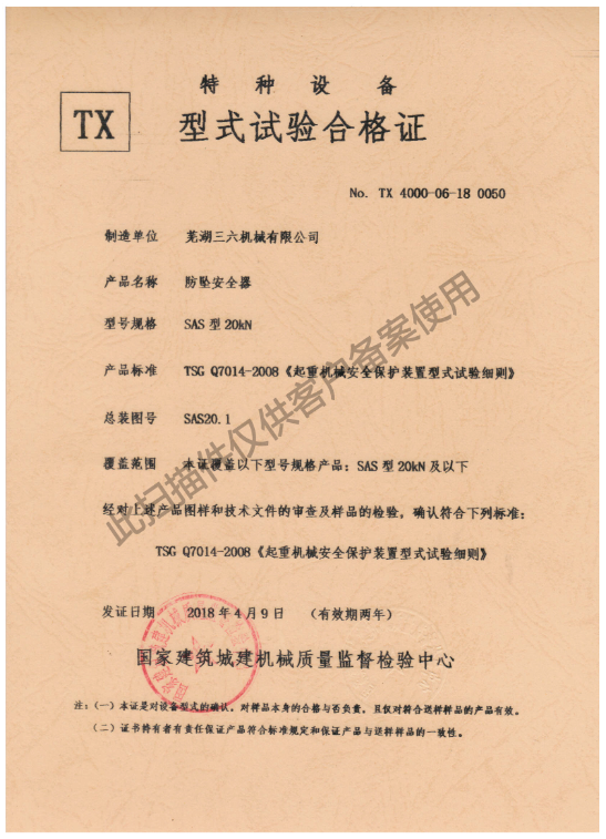 防墜器作為起重機(jī)械的安全裝置,需經(jīng)過國家建筑城建機(jī)械質(zhì)量監(jiān)督檢驗(yàn)中心檢驗(yàn),并且每兩年需要復(fù)審一次。擁有《特種設(shè)備型式試驗(yàn)合格證》才能被允許生產(chǎn)制造及銷售。